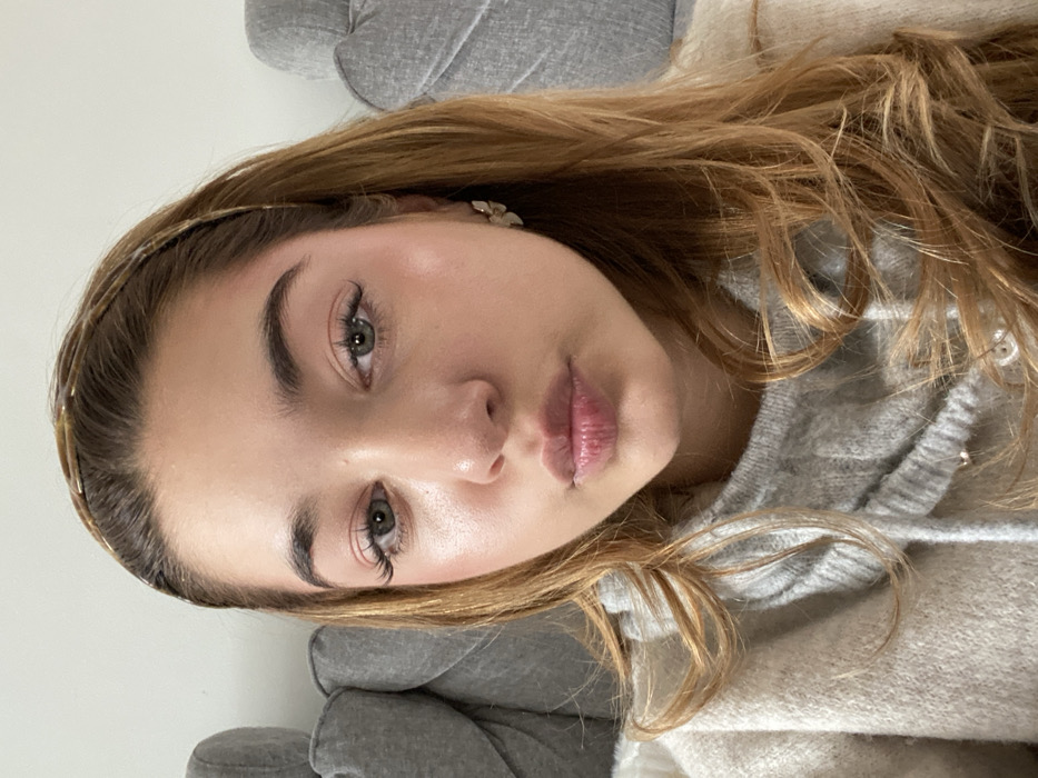 An image depicts a close-up, chest-up indoor selfie of a young female, approximately 18-25 years of age