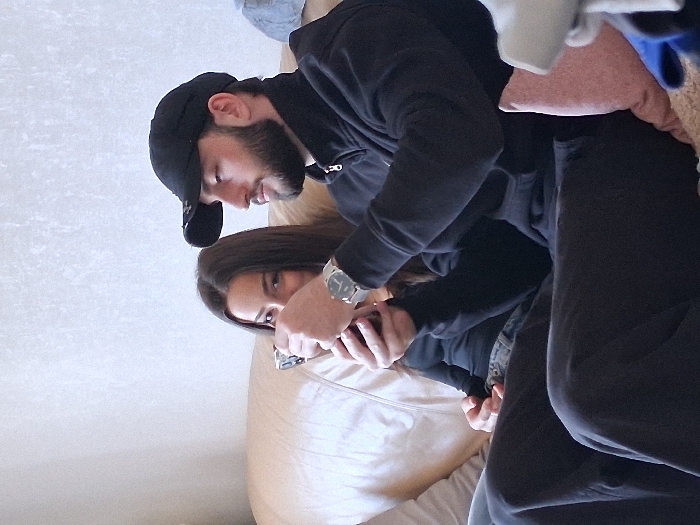 The image depicts two individuals seated on a light-colored sofa within an indoor setting in the city of Unknown, Unknown. On the right, a male subject with a beard wears a black baseball cap, a black zippered hoodie, and dark sweatpants, with a silver-toned wristwatch on his left wrist. He is holding a small, silver-colored electronic device, resembling a compact camera, with both hands, appearing to operate or view it. To his left, a female subject with long dark hair, wearing a dark long-sleeved top and blue jeans, is partially visible. Her right hand is positioned near the device, and she is looking towards the camera with a faint smile. The background consists of a light-colored, textured wall. A pink decorative cushion and other obscured fabrics are partially visible on the far right.