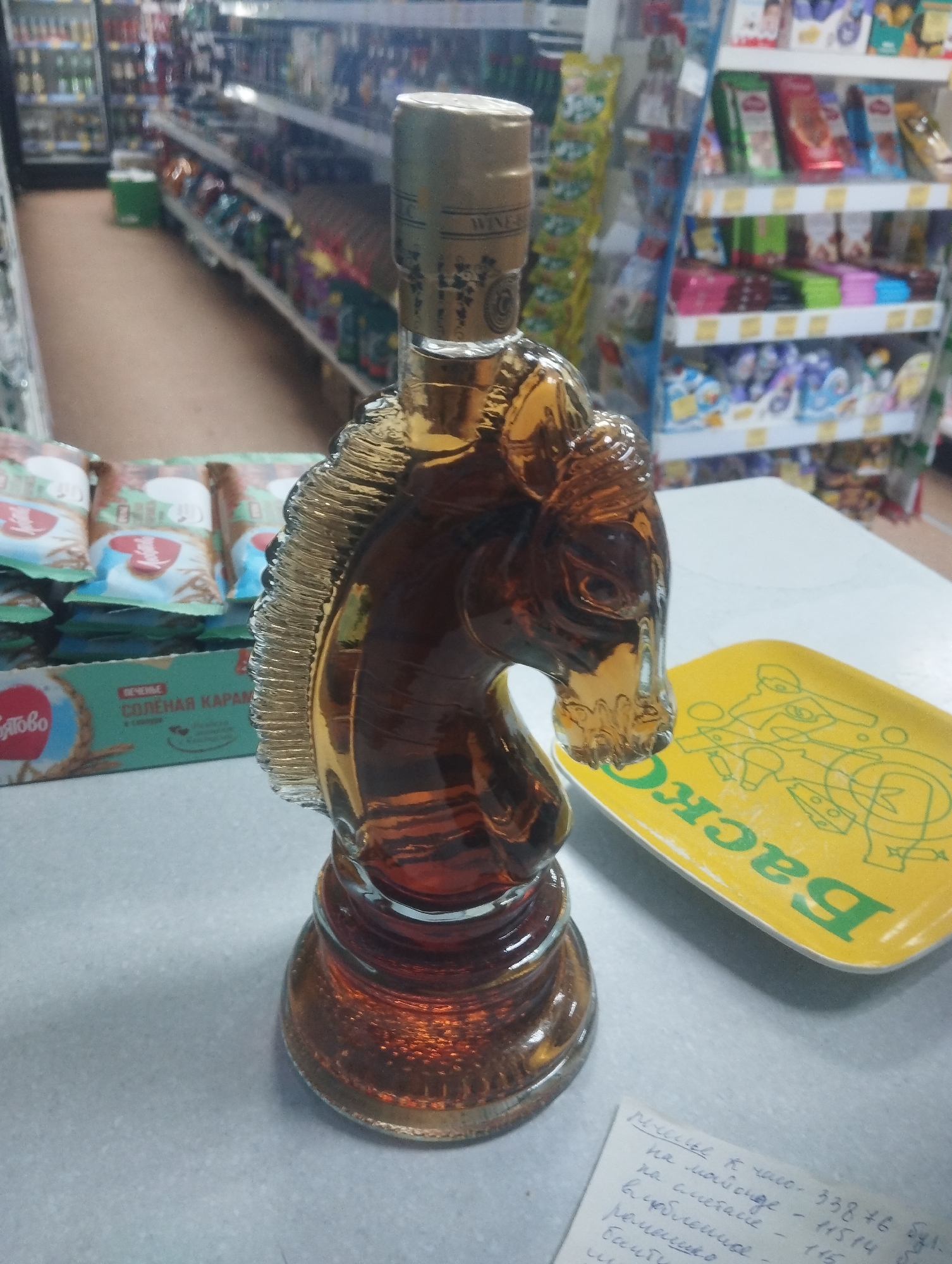 horse-shaped liquor bottle sitting on a gray counter in a store. The bottle is filled with a dark amber liquid. A yellow tray with green markings and the word "Bаск" is next to the bottle. The tray and bottle rest on a note. Shelves of products are visible in the background.