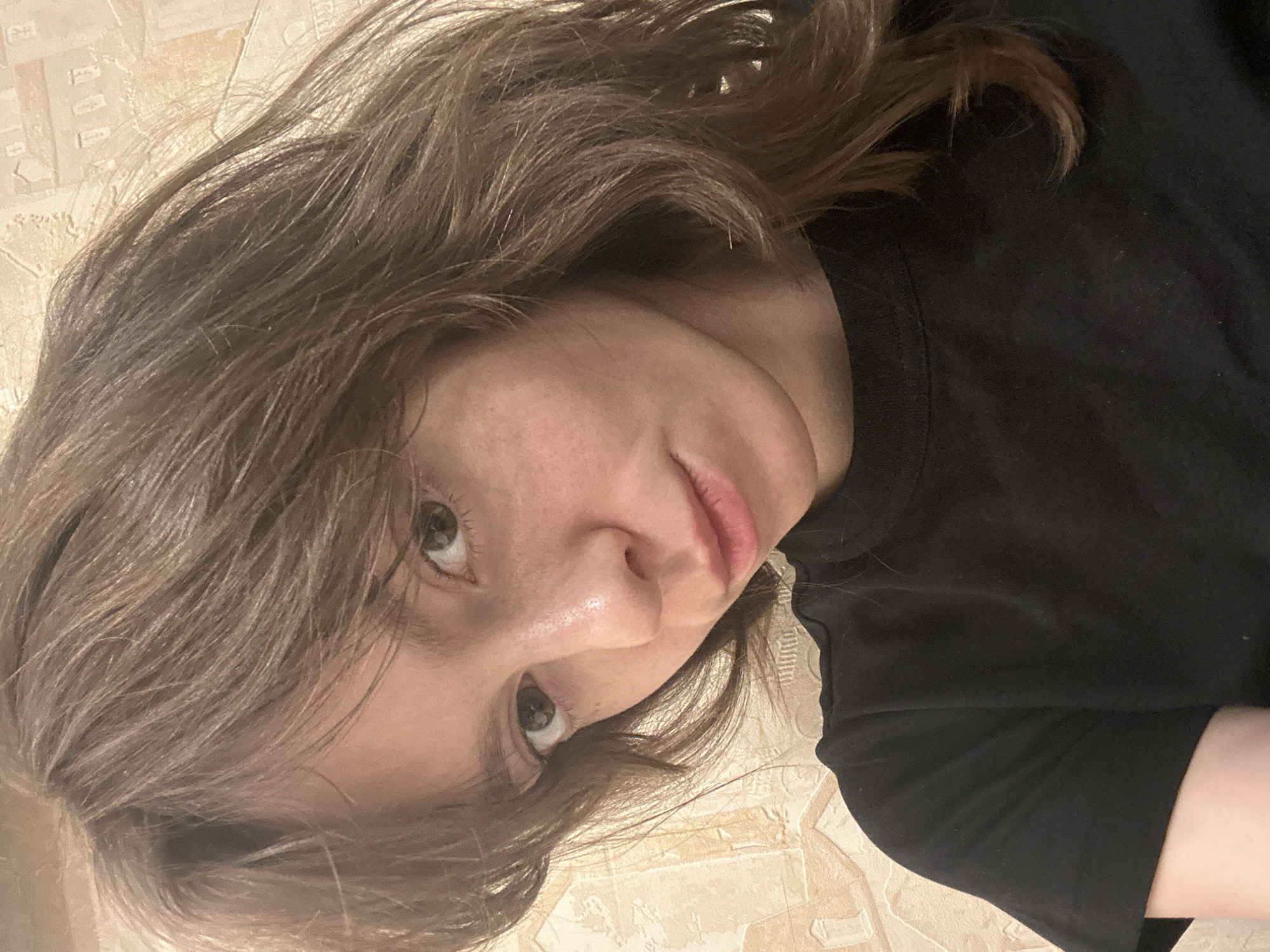 A close-up photograph depicts an adult female positioned against a wall within a residential interior. The subject has medium-length, wavy brown hair, brown eyes, and a light complexion with visible pores and light freckling across her nose and cheeks. She is wearing a plain black crew-neck t-shirt and looks directly at the camera with a neutral to slightly pouting expression. The background consists of a wallpapered wall featuring a repeating pattern of stylized light-brown architectural motifs (houses or buildings) on a textured beige background. Based on the wallpaper pattern consistently found in residential settings, the location is identified as a residential interior in Moscow, Russia.
