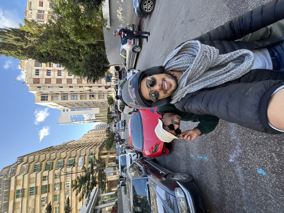 Two adult males are depicted in a selfie taken from a low-angle perspective on an urban street in Tangier, Morocco