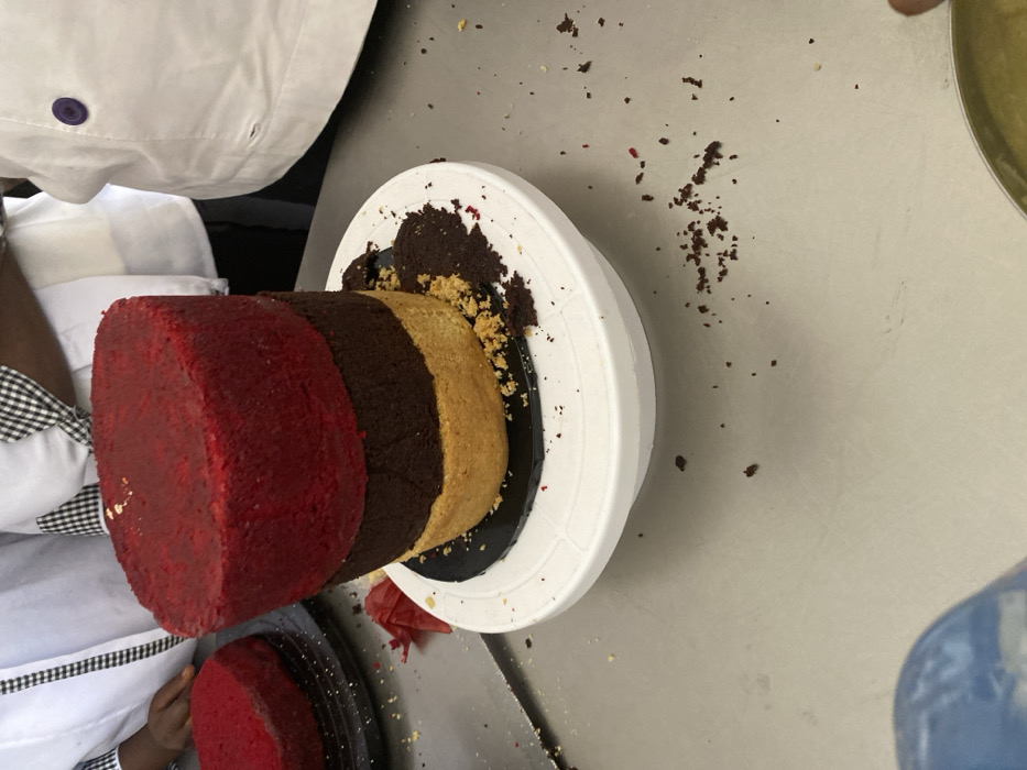 The scene is set in a professional kitchen or bakery environment within the city of Gwarinpa, Nigeria. A multi-tiered cake is centrally positioned on a white rotating cake stand, which rests on a light grey metallic countertop. The cake consists of three distinct circular layers: the top layer is red with a textured, possibly crumb-coated surface and traces of gold flakes; the middle layer is dark brown; and the bottom layer is light brown or yellow. This cake is placed on a black circular cake board. Numerous dark brown, light brown, and some red cake crumbs are scattered around the base of the cake stand and across the countertop, indicating ongoing preparation. To the left, a separate circular red cake layer is visible on another black cake board, with a silver spatula or knife and a piece of crumpled red material nearby. In the background, partially visible individuals wearing white chef jackets, one with black and white checkered sleeves and another with a purple button, are present, suggesting personnel involved in the baking process.