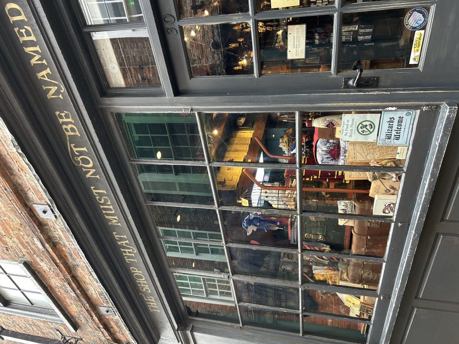storefront of "The Shop That Must Not Be Named." The display window is divided into panes and contains various items, including vintage trunks, maps, and a sign that reads "Wizards Welcome." Other signs say, "No Food or Drink Please," and "CCTV in operation." The building's address number "30" is visible above the window. The shop appears to be located on a brick street.