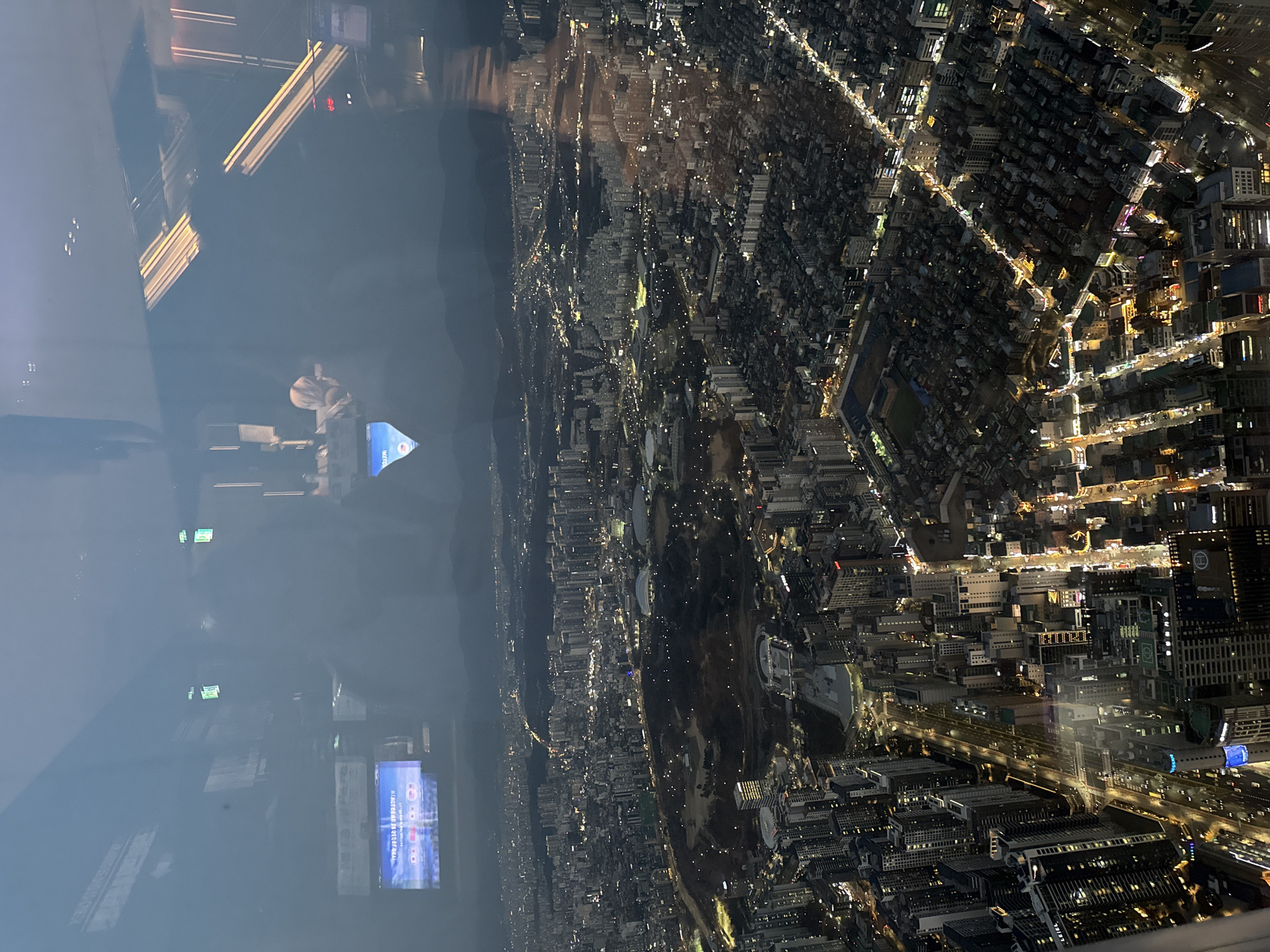 The image presents a high-angle, panoramic view of the city of Seoul, South Korea, at night, observed from within a building through a reflective glass window