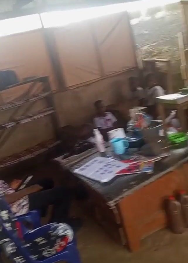 The camera pans across the inside of a classroom, revealing a man sitting on a blue plastic chair while looking at his phone, and a few students in school uniforms, sitting and standing by their desks. There is a shelf with books on it in the background. The classroom has a simple, makeshift construction.