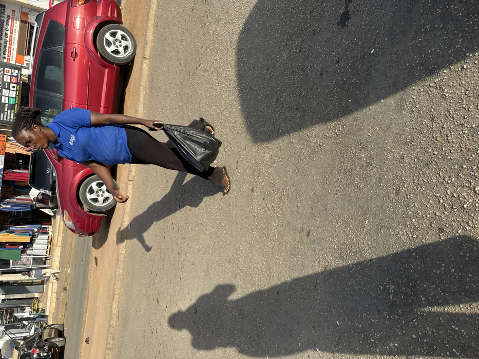 A woman in a blue shirt and black pants walks on a street near a red car. She carries a black plastic bag in her left hand. The street has asphalt and appears to be a mix of residential and commercial areas. The day is sunny, creating strong shadows on the ground from the woman and a car. A building with store signs is visible in the background.