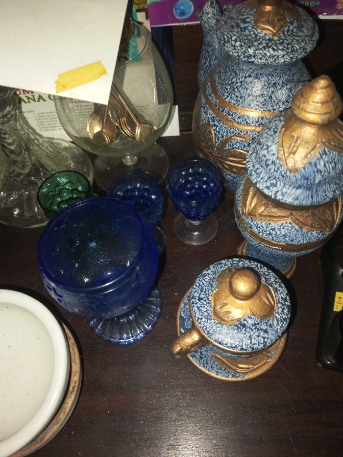 A cluttered tabletop displays assorted glassware and decorative items. A clear vase holds silver spoons. Nearby are several blue goblets and a small green bowl. A teapot and covered container with a speckled blue and gold pattern dominate the scene. A white bowl sits at the edge of the image. The background shows packaging and papers, adding to the disarray.