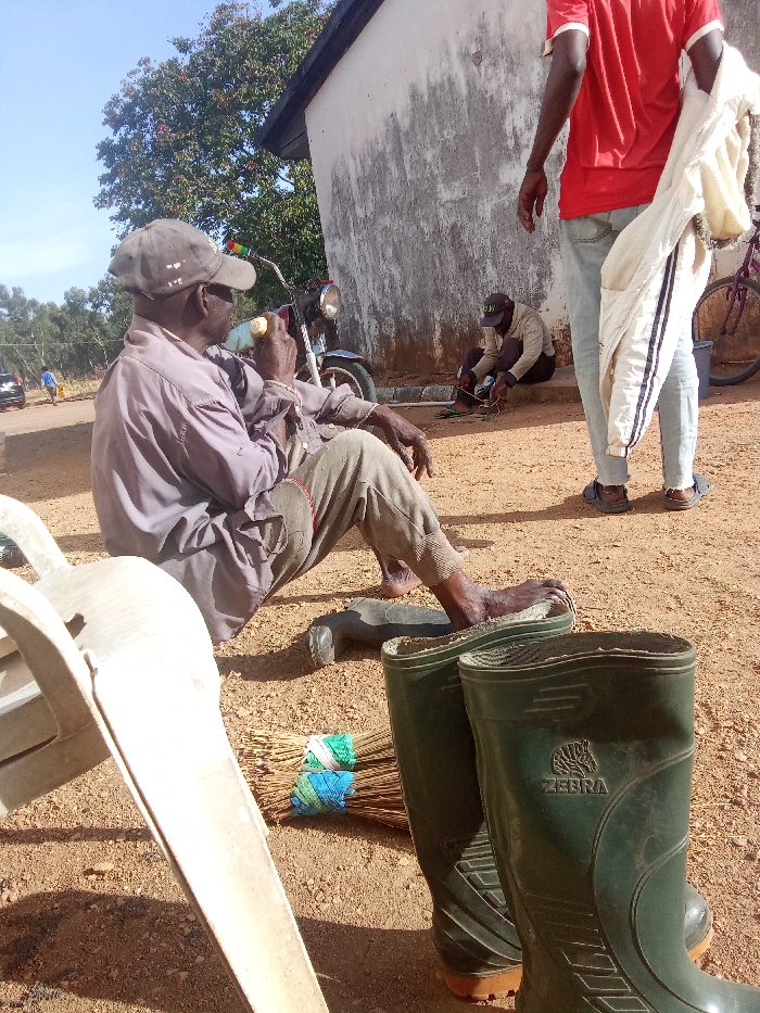 An elderly man sits on the ground, eating near a pair of green rubber boots, a broom, and a white plastic chair