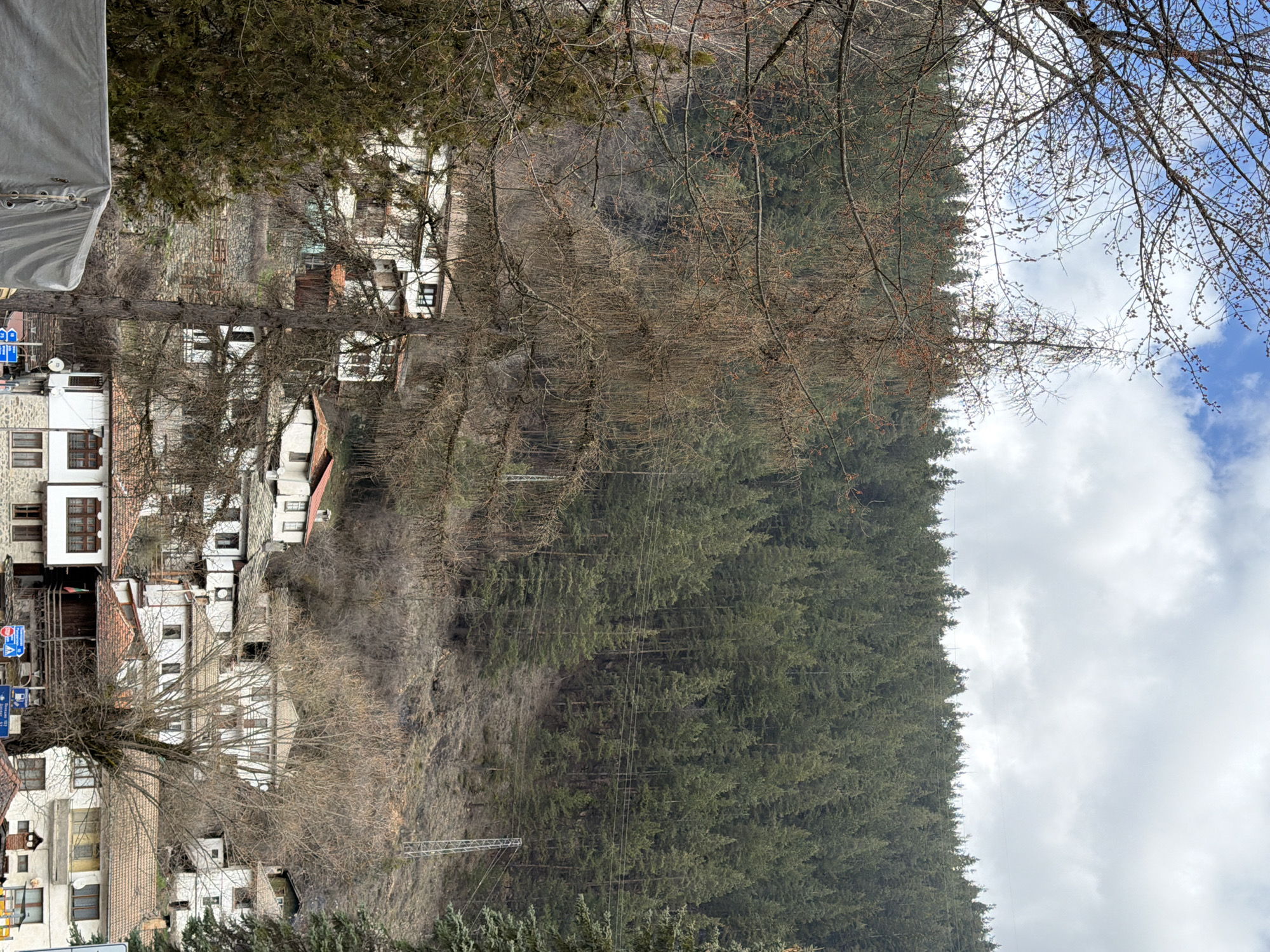 view of Shiroka Laka, Bulgaria, known for its traditional architecture. The left side features a cluster of old houses with white walls and terracotta roofs, some with stone detailing. A canopy is on the top left of the frame. Bare trees with intricate branching patterns are scattered throughout the village and along a steep, rocky slope adjacent to the buildings. To the right, a dense forest of evergreen trees covers the hillside, extending upward towards the sky. A series of power lines and towers traverse the slope of the hill. The sky is partly cloudy, with patches of blue visible amidst the white clouds. The scene appears to be taken in late fall or early spring.