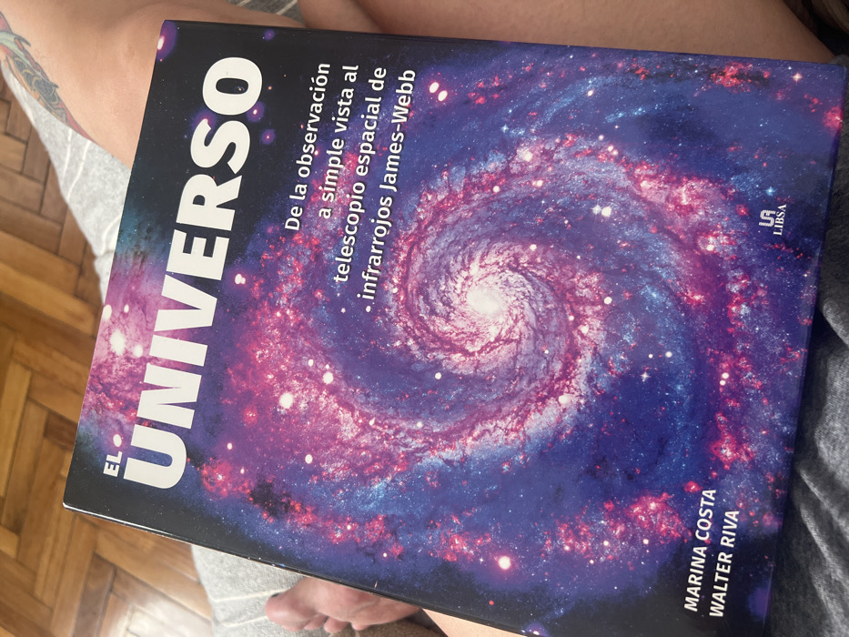 A book titled "El Universo" (The Universe) lies on a person's lap