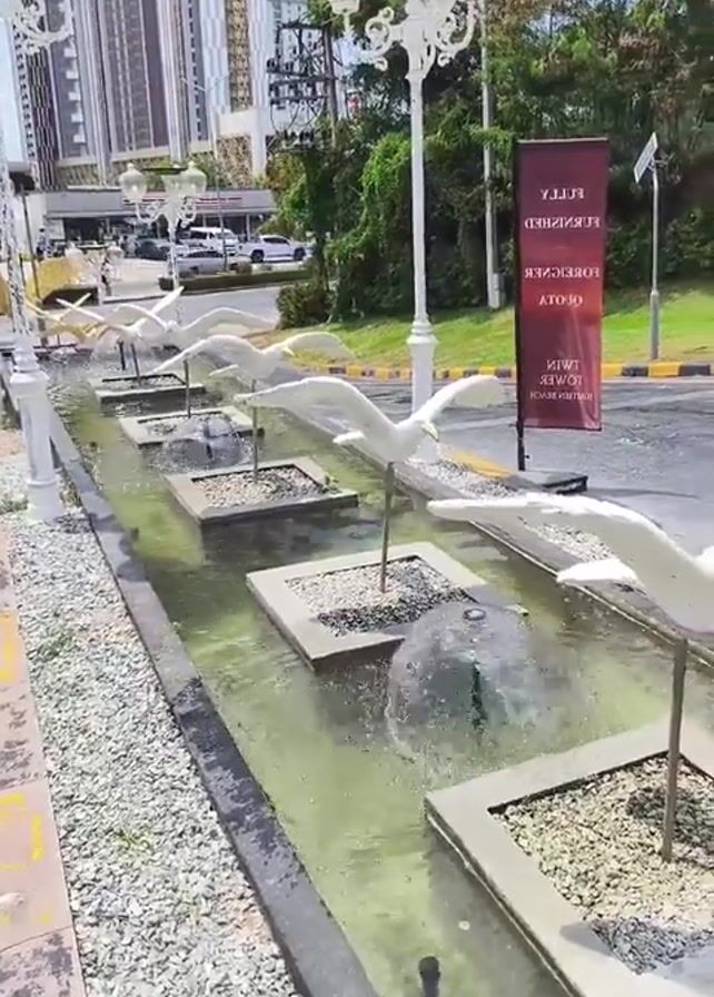 decorative water feature beside a road. The water feature is a long rectangular basin with multiple square concrete islands. Each island has gravel on top and a metal rod supporting a white sculpture of a bird in flight. Small fountain spouts rise from the water in some of the islands. The water in the basin is somewhat murky and green. Alongside the basin is a gray gravel border. On the other side of the road, there is a grassy lawn and some trees. In the background are some high-rise buildings. There are signs placed near the fountain promoting a showroom. The video seems to be shot on a sunny day.