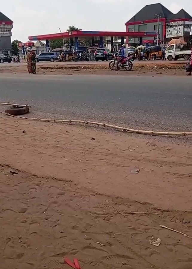 street scene in what appears to be an urban area. There is a gas station across the street with multiple cars and motorcycles near it. Pedestrians walk on the side of the street, including one person wearing a pink outfit carrying a bag. Vehicles, including a white van and a pink van, drive on the road. The foreground is sandy dirt, with discarded items like a red ribbon, a tire, and pieces of wood. The sky is overcast.
