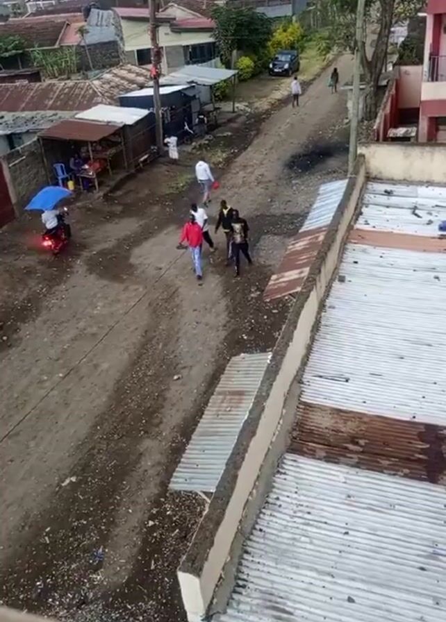neighborhood scene from an elevated perspective, possibly from the top of a building. A dirt road runs through the center of the frame, with various buildings and structures on either side. A group of four people are walking together down the road, they are dressed casually. A motorcyclist with a blue umbrella is seen parked near a small market stall. Other people can be seen walking further down the road. The buildings appear to be modest in size, with a mix of materials. The overall environment suggests a residential area in a developing region. The weather appears overcast.