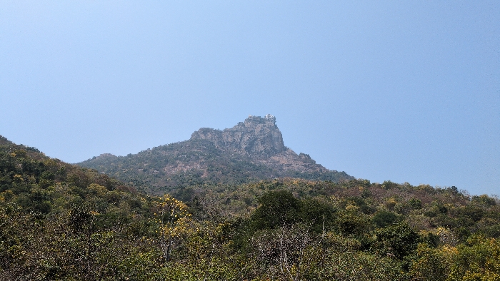An exterior long shot depicts a prominent, rugged mountain peak situated against a clear, light blue sky. A distinct white, multi-tiered architectural structure, likely a temple complex, is visible atop the mountain's summit. The slopes of the mountain and the immediate foreground are densely covered with varied vegetation, displaying shades of green, brown, and yellow foliage, indicative of a natural, forested landscape. No individuals are present within the frame, and no specific actions or interactions are occurring. The scene is located in the city of Kadaladi, India.