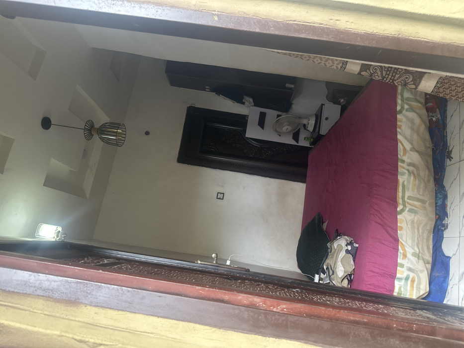 This image captures the interior of a room, likely a bedroom, viewed through a partially open, ornate dark wooden door. The scene is located in the city of Nnewi, Nigeria. **Objects and Environment:** * **Foreground (left):** A segment of a yellow/ochre-painted wall is visible, along with the partially open dark brown wooden door featuring carved panels and a golden door handle. A white charging cable hangs from the door handle. * **Ceiling:** The white ceiling features a recessed rectangular design and a smaller square recess. Two light fixtures are present: a rectangular, white, wall-mounted fixture on the upper left, emitting light, and a black metal cage-style pendant light hanging from the center. * **Walls:** The walls are predominantly white or off-white, showing some discolouration or dirt accumulation near the floor level on the left side. A square white electrical outlet or switch is visible on the left wall segment. * **Floor:** The floor is covered with white tiles. * **Bed:** A bed occupies the center-left of the room. It has a maroon or magenta-colored duvet. A dark green pillow and a pile of folded clothing, including a camouflage-patterned item, rest on the duvet. The bed frame is covered by a multi-colored patterned sheet, and blue fabric is visible beneath it. * **Rear Door:** On the rear wall, a closed dark brown wooden door with intricate carvings is visible. * **Right Side of Room:** A tall, dark brown wardrobe stands against the right wall. Adjacent to it, a white shelving unit is present. On its lower shelf, a white oscillating fan, a small dark container, and other minor objects are arranged. * **Curtain:** A patterned curtain or fabric hangs vertically along the far right edge of the frame. **People, Actions, and Interactions:** * No people are visible within the frame. * No active actions or interactions are depicted. The scene is static.
