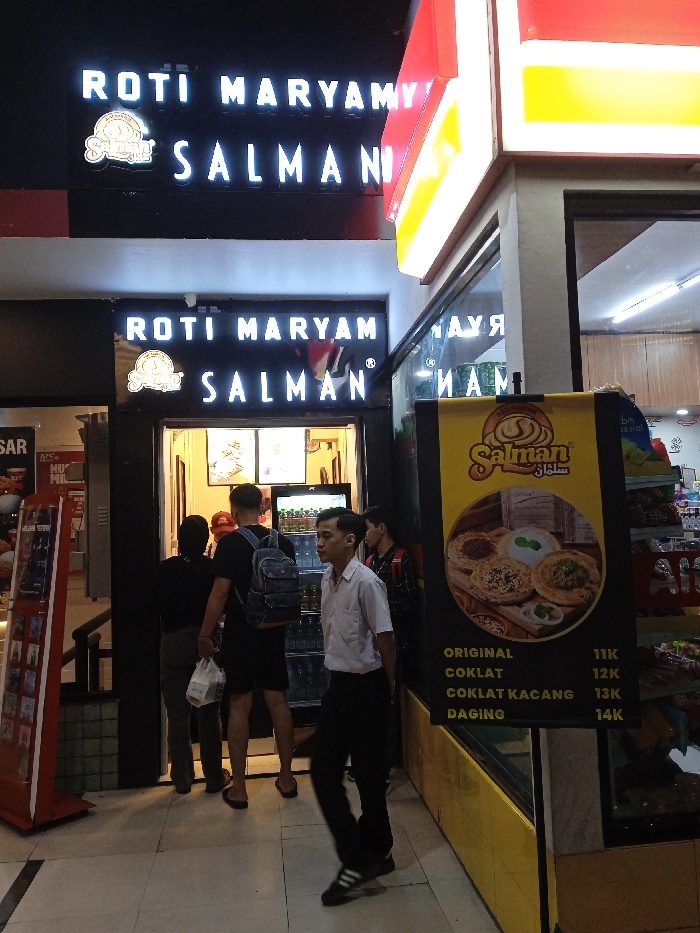 The image depicts an indoor commercial corridor in Semarang, Indonesia. The central subject is a storefront for "Roti Maryam Salman," indicated by two illuminated black signs with white LED lettering. Four individuals are present. In the foreground, a male subject wearing a light-colored short-sleeved shirt, dark pants, and striped athletic shoes walks from right to left. Three other individuals are positioned at the open entrance of the "Roti Maryam Salman" store, facing inwards; one male, viewed from behind, wears a dark top, dark shorts, and a blue backpack, holding a white plastic bag. To the right of the store entrance, a large yellow standing sign displays the "Salman" logo, images of various Roti Maryam dishes, and a price list including Original (11K) and Daging (14K). To the left, a red brochure display rack and partial "KFC" signage are visible. The flooring consists of light-colored tiles, and the area is illuminated by overhead lighting. An adjacent retail space is visible to the right of the Roti Maryam Salman store, past the yellow sign.