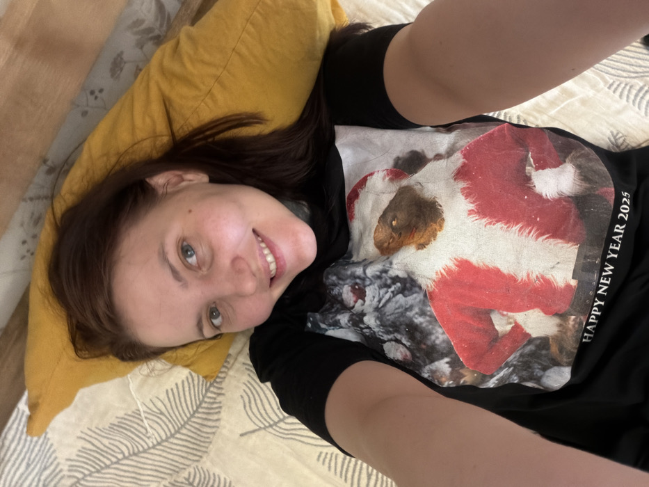 A woman smiles at the camera while lying on a bed. She rests on a yellow pillow atop a patterned sheet. The woman wears a black t-shirt with a graphic print featuring a dog dressed as Santa Claus with the text "HAPPY NEW YEAR 2025." Her arms are visible, framing the shot. The background is slightly blurred, emphasizing the woman as the subject.