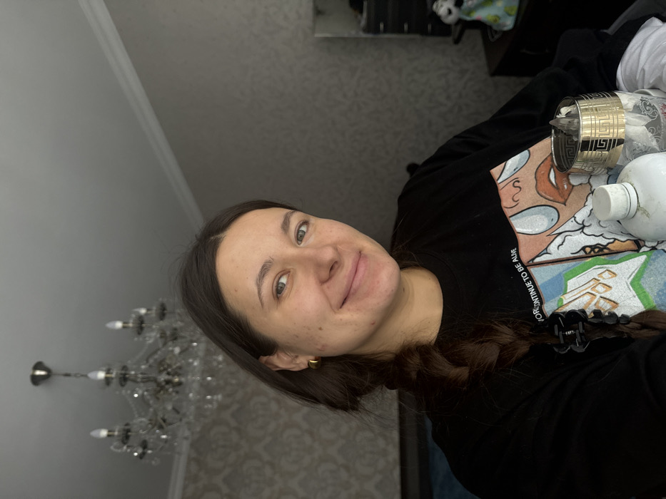 A single adult female is depicted from the chest up in a residential room in Vysokinichi, Russia