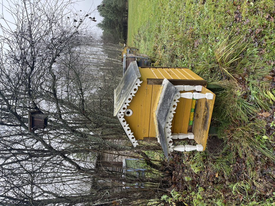 This image captures an apiary located in Petriškė, Lithuania. The foreground features a decorative, brightly painted yellow beehive, adorned with white, scalloped trim along its dark-colored roof edge and supported by four white turned posts creating a small porch. This beehive rests on a green base above ground level. To the right, a row of similar beehives, varying slightly in color and design, extends into the mid-ground, positioned along the edge of a grassy field. On the left side of the image, the ground is covered with fallen brown leaves and sparse green undergrowth. Behind the beehives, a dense thicket of bare deciduous trees with thin branches dominates the mid-ground. A small, dark-colored wooden birdhouse or nesting box is visible high up in the branches of one of these trees. Further into the background, a line of slender deciduous trees with light-colored bark runs horizontally, separating the grassy field from a denser stand of dark green conifer trees. The sky is overcast and grey, indicating a dull, possibly cool day. No people or animals are visible, and no actions or interactions are depicted.