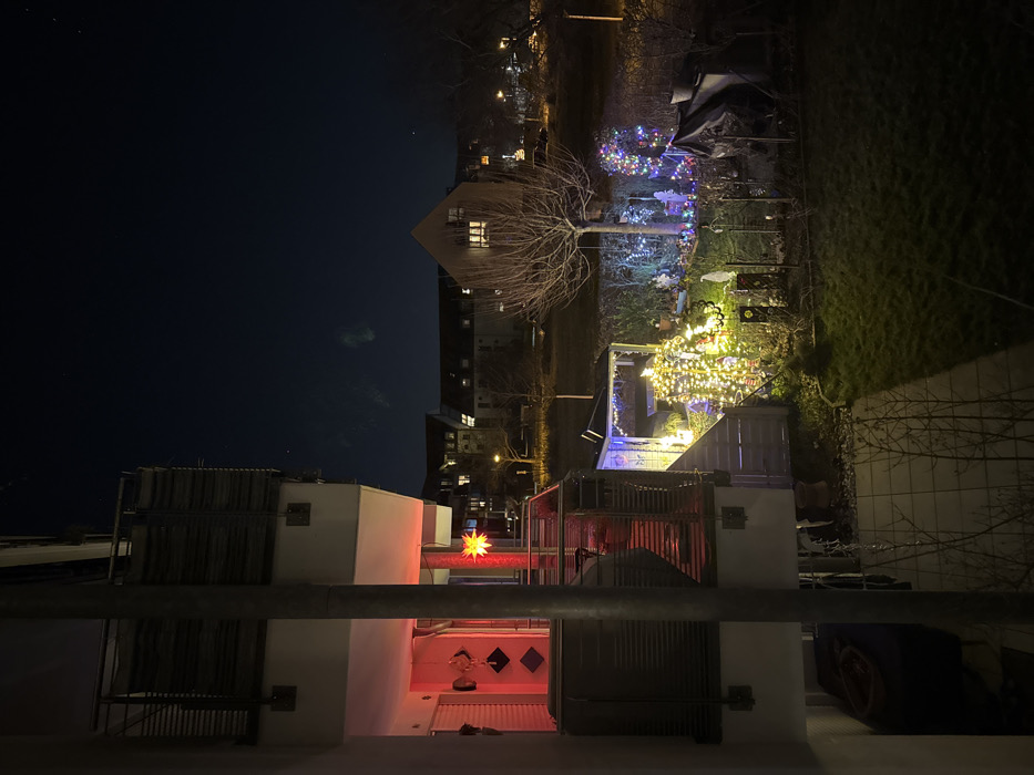 At night, a cityscape is captured from a high vantage point, looking out over rooftops and festive garden decorations. A garden is adorned with multiple lights, including a tree. Buildings stand in the distance under a dark sky. A red star decoration is present on a balcony. The photograph showcases the interplay of light and shadow, and the urban nightscape.