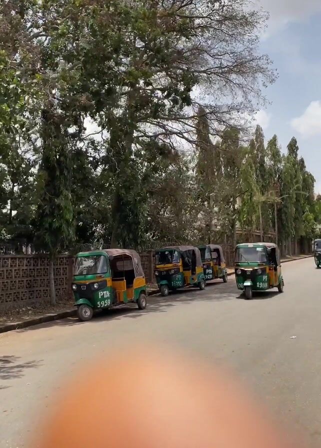 street with several green and yellow auto rickshaws parked and driving along the side of the road. A fence runs along the roadside next to some trees. The sky is partly cloudy. Part of a human body is visible in the foreground of the shot.