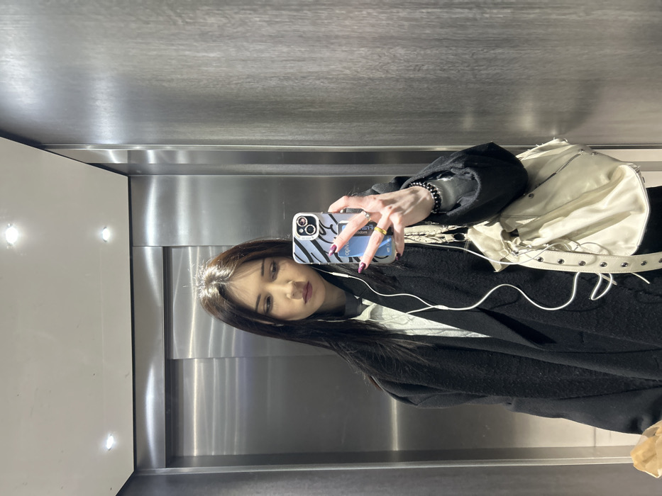 The scene is an interior view of an elevator, located in Cachan, France. A sole individual, a female with long dark hair, is depicted taking a mirror selfie. She wears a dark, open, long-sleeved outer garment over a lighter-colored top and has white wired earphones in her ears. Her right hand, adorned with dark red nail polish, a gold-toned ring on her index finger, and a dark beaded bracelet on her wrist, holds a smartphone with a light-colored, striped case. A light-colored drawstring bag with metallic stud details hangs from her left side, and a brown paper-wrapped object is partially visible at the bottom left of the frame. The elevator features brushed metallic panels on the left and rear, a dark, textured wood-like panel on the right, and a white ceiling with two recessed spotlights.