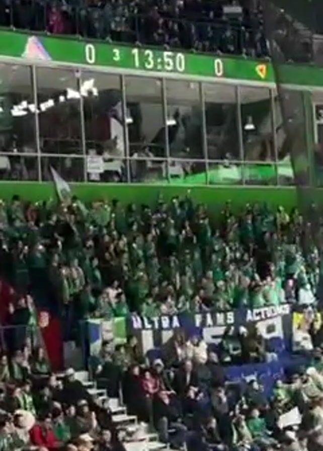 large crowd of people at a hockey game, all wearing green clothing and cheering enthusiastically. The scoreboard shows the game is in the first period with 13:50 remaining, and the score is tied 0-0. Many of the fans are holding up their phones with the flashlights on, creating a sea of light. A banner that says “ULTRA FANS” is in the front of the shot. The environment is bright, and the energy level of the crowd is high.