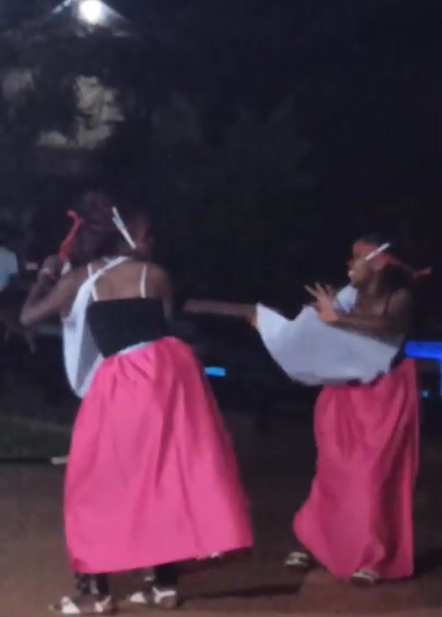 Two women dance outside at night. They are both wearing long pink skirts, black tops, and white pieces of fabric. They hold the fabric out and sway it as they move. There are plants and a few illuminated structures visible in the background. The scene is dark.