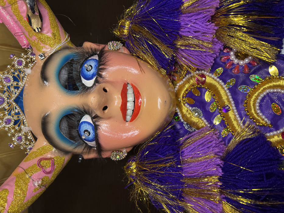 An elaborately decorated doll head displays a painted face with wide blue eyes, fake eyelashes, and a bright red smiling mouth revealing white teeth. Sparkling earrings adorn each ear. The doll wears a jeweled headdress and a costume of purple and gold fringe and sequins. A pink limb extends from the side, decorated with gold glitter and a pink heart.