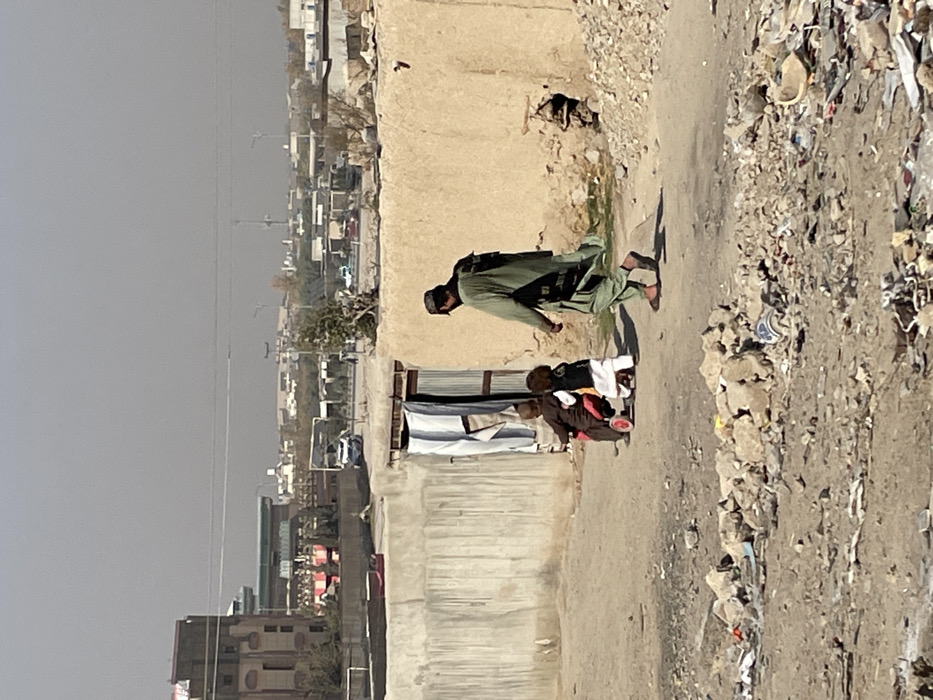 A horizontal shot captures a man in traditional attire, including a green robe and black head covering, walking on a dirt path. A group of people is gathered to the left of the man near a building structure with a blue and white striped covering. The path on the right side of the image is strewn with debris and trash. A city skyline is visible in the background, set against a hazy sky.