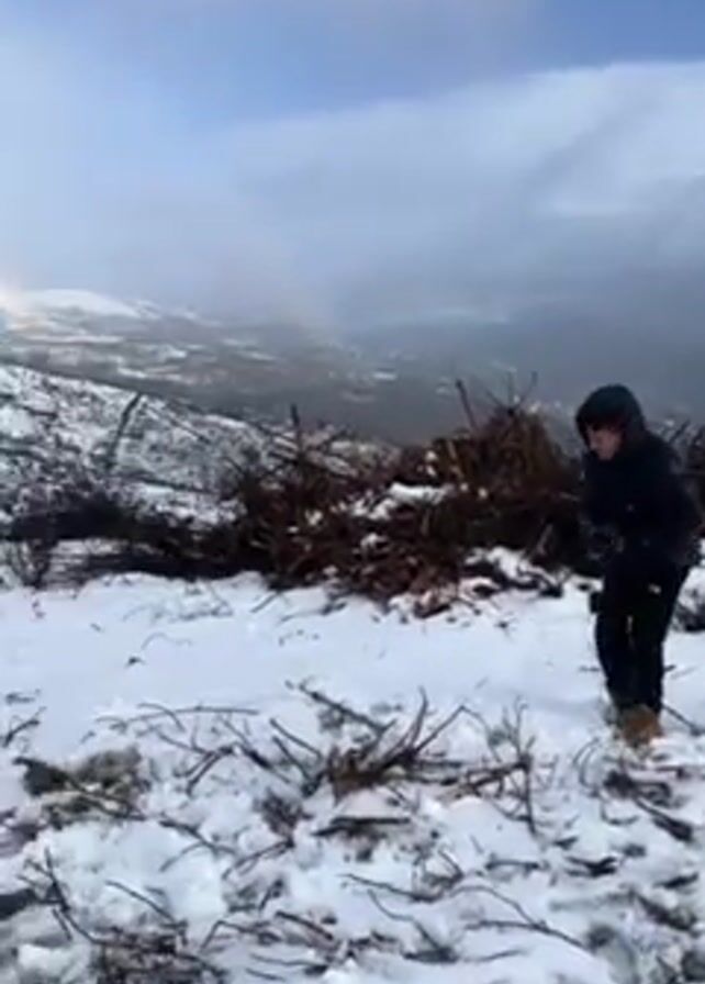 A person in a black hooded jacket, black pants, and tan boots is throwing snowballs near a pile of dead branches