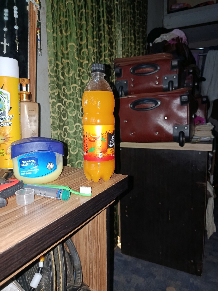 An interior scene features a wooden surface with various items: a bottle of orange juice, a container of Vaseline, a toothbrush, and other toiletries. Behind this is a dark cabinet. Stacked on top of the cabinet are two brown leather suitcases with wheels. A green patterned curtain hangs in the background. In the upper background, there's a glimpse of clothing and other items stored on a shelf or rack.