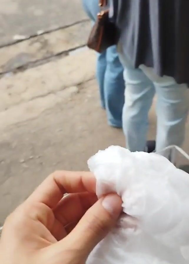 A hand holds up a white plastic shoe cover. The camera looks down into a clear rectangular container full of shoe covers. Several people stand around the table, some picking up shoe covers and putting them on. The surface the people are standing on is concrete.