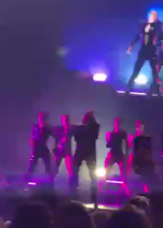 A concert stage is lit in purple and blue, with a blonde female singer in a black outfit surrounded by dancers in black. On a large screen above the stage, a similar performance is projected. The dancers move in sync while the singer performs, and the audience appears to be enjoying the show, as visible in the bottom of the frame.