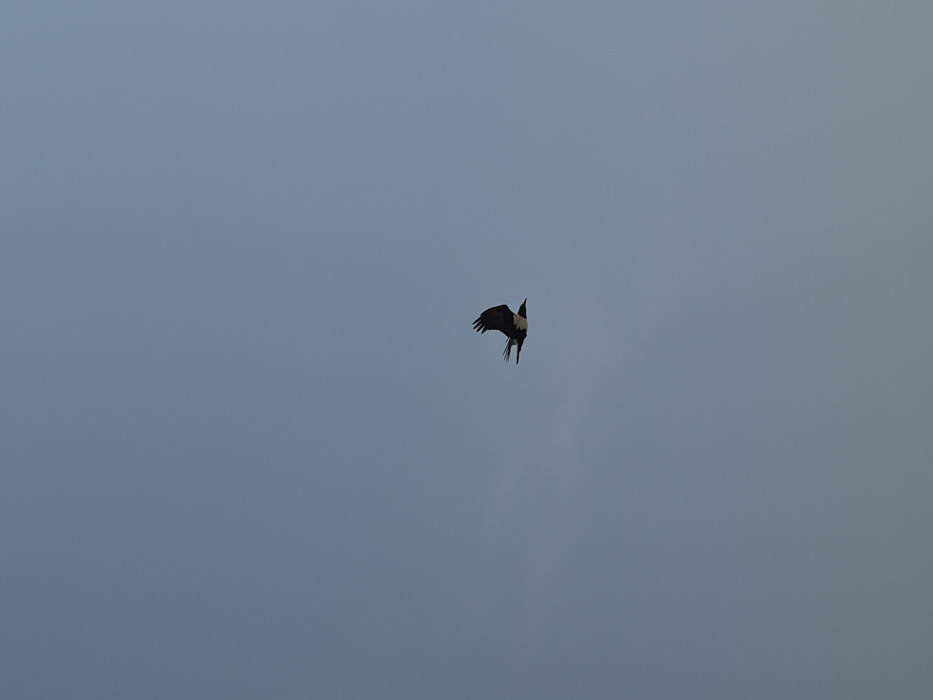 - "A single, dark-feathered bird, identified as a bicolored avian species with lighter ventral plumage, is observed in mid-flight against a clear, uniform pale blue sky" by FM-rkm0j2, licensed under CC BY 4.0