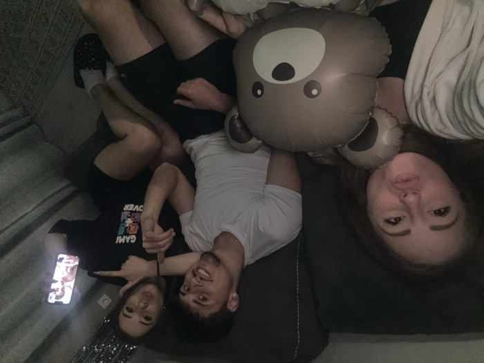Three individuals are depicted in an indoor setting, seated close together on what appears to be a dark upholstered couch or bed, under dim lighting. The image provides no discernible information regarding its specific location within Kipra, Bulgaria. On the left, a young adult female with long brown hair, wearing a light-colored top over a dark garment, poses for the camera with pursed lips. She holds a brown, inflatable teddy bear balloon to her left. In the center, a young adult male with short dark hair, wearing a white t-shirt and dark shorts, smiles directly at the camera. His right arm is positioned around the neck of the female to his right. On the right, a young adult female with dark hair, wearing a black t-shirt with "GAME OVER" text and graphics, dark shorts, white socks, and dark patterned slides, looks at the camera. She holds a smartphone in her left hand, which displays an image of a shirtless individual. She points at the smartphone screen with her right index finger, while her left hand simultaneously forms a "peace" sign gesture. Her legs are crossed and rest on the male's lap. Metallic tinsel-like decorations are visible in the upper right background.