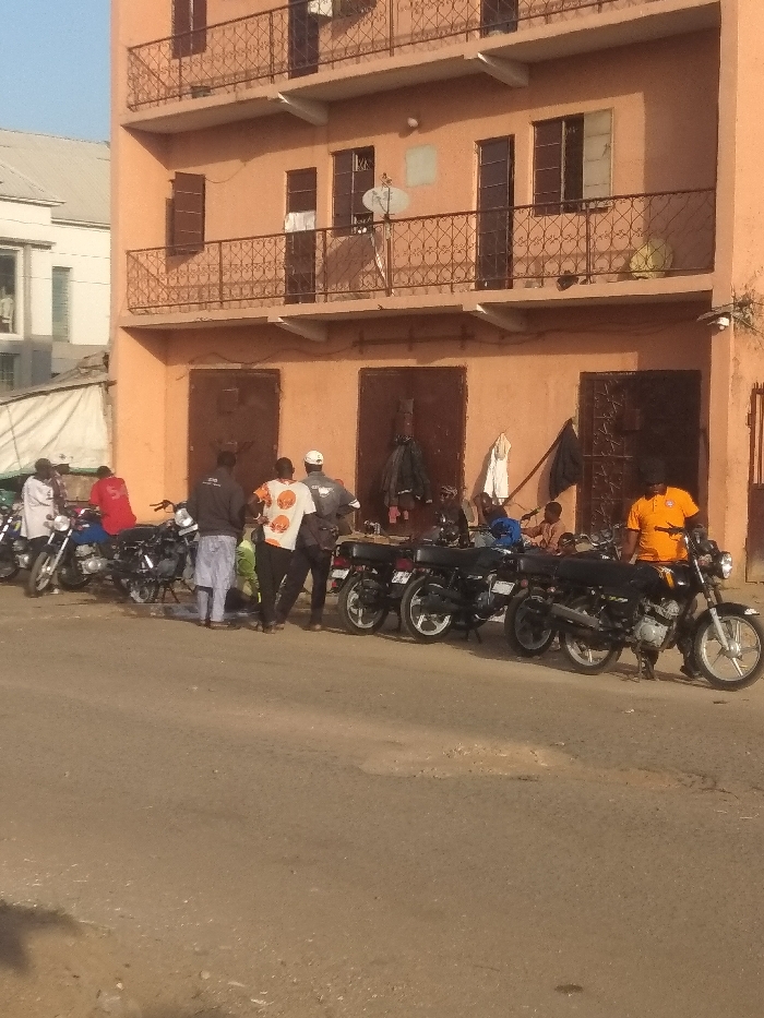 A group of people are standing next to parked motorcycles in front of a multi-story building. The building is a light peach color and has ornate railings on the balconies of the upper floors. Some of the windows on the upper floors are open. A white building is visible in the background. The street in front of the building is cracked and in disrepair. The sky is a clear, pale blue.