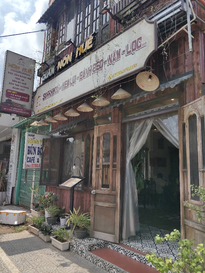 The image displays the exterior of a two-story restaurant named "Quán Nón Huế" located at 27 Nguyễn Sinh Cung, Vỹ Dạ Ward, Huế City, Vietnam