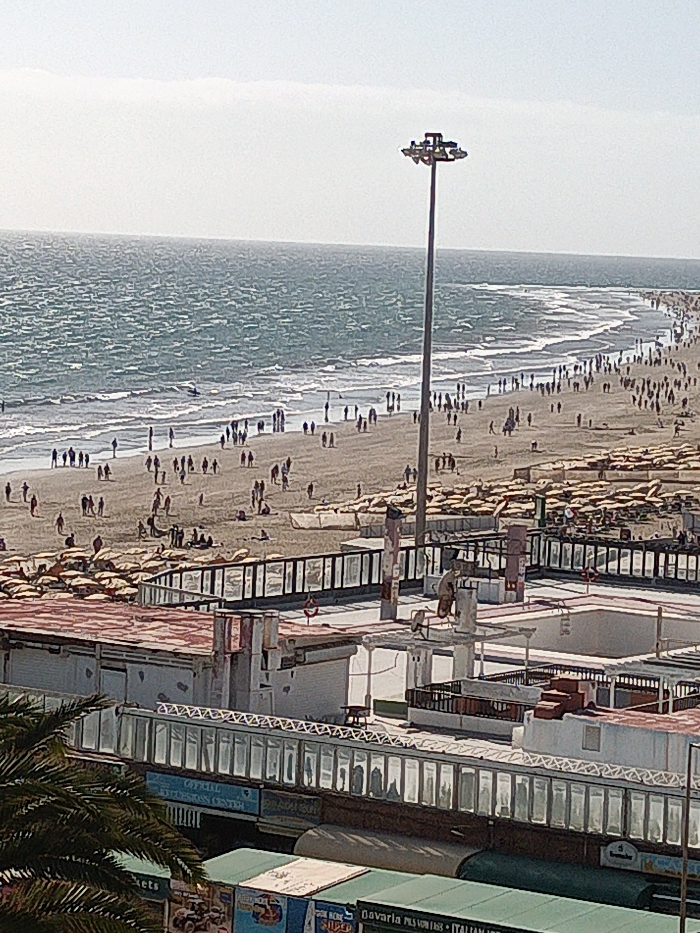 An elevated, high-angle view depicts a busy coastal scene in San Bartolomé de Tirajana, Spain