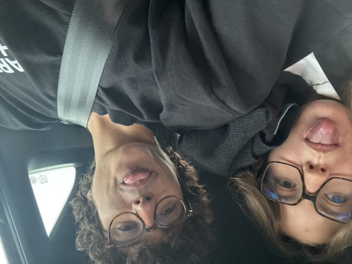 The image displays two individuals inside a vehicle, located in Oeiras, Portugal. The person on the left, with light brown hair and dark-framed rectangular eyeglasses, is wearing a dark garment over a white collared shirt and has their tongue extended. The person on the right, possessing curly dark hair and dark-framed round eyeglasses, exhibits a small mustache, wears a dark t-shirt with a grey seatbelt diagonally across their chest, and also has their tongue extended. Both individuals are looking directly at the camera. The vehicle interior is dark, with a car window and a partial label visible in the upper right background.
