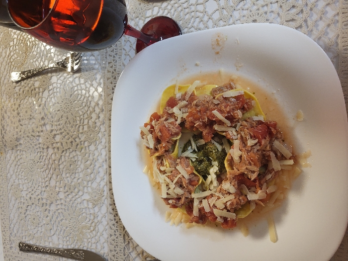 - "A plate of pasta, potentially ravioli, topped with a red, chunky sauce and grated cheese sits on a white square plate" by FM-RwSOB3, licensed under CC BY 4.0