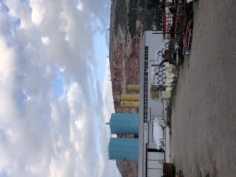 Two blue industrial tanks sit beside a building. Yellow tanks line a cliff face. White spherical objects are stacked near the building. Construction materials lie to the right. The scene is set against a hillside and cloudy sky. A concrete mixer truck is partially visible near the building. A gravel area surrounds the scene.