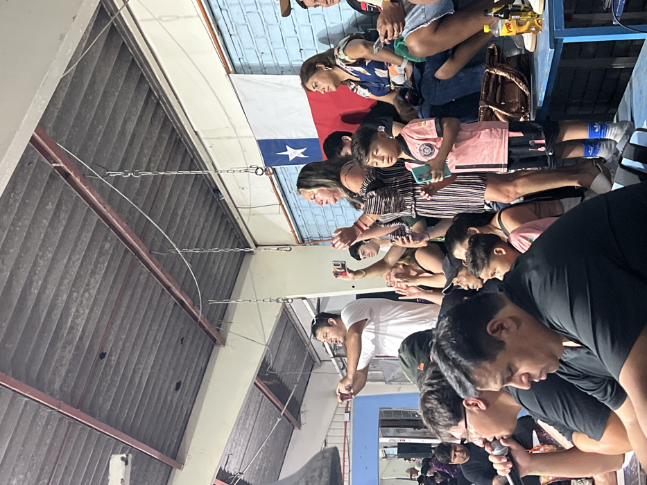 An indoor scene in Arica, Chile, captures a crowd observing an unseen event