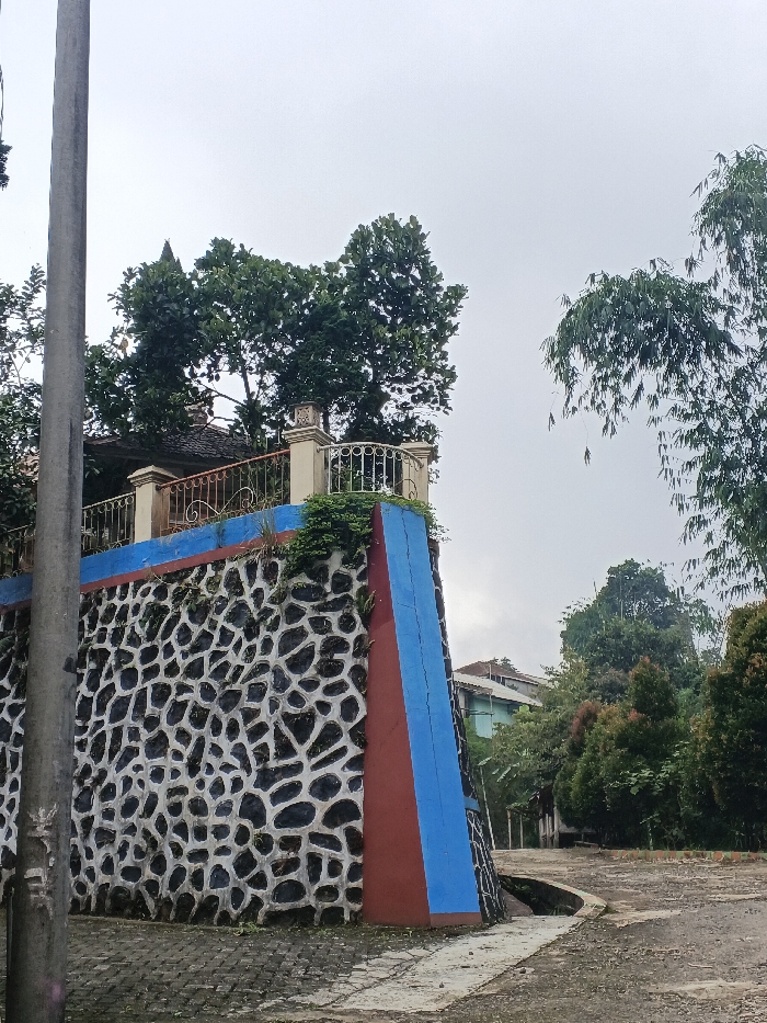 The image depicts a street scene in Makilala, Philippines, characterized by a prominent retaining wall. The wall, forming a corner, features a lower section composed of irregularly shaped dark stones set in white mortar. Above this, the wall is painted with horizontal bands of red and blue. The top of the wall supports a structure with light-colored pillars and a white metal balustrade, indicative of an elevated patio or balcony, from which dense green foliage of trees is visible. A grey utility pole occupies the left foreground. The ground level transitions from a paved, possibly cobblestone-patterned surface in the immediate foreground to a dirt or gravel path extending to the right. A narrow concrete gutter runs along the base of the wall. To the right, various trees and shrubs with green and reddish foliage are present. In the background, partially obscured by vegetation, are residential structures with light-colored walls and sloped roofs. The sky is overcast and light grey, suggesting a cloudy day. No individuals or specific actions are visible.