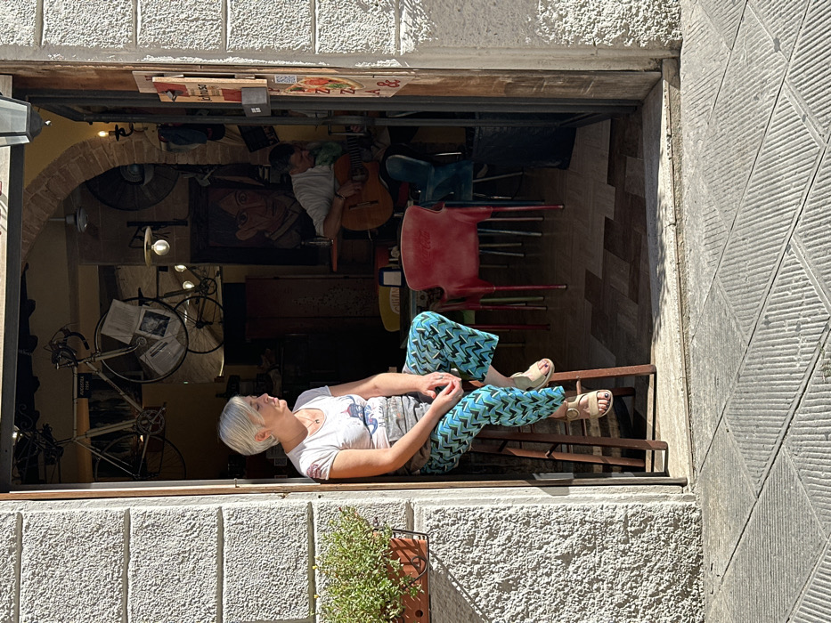 The image depicts an open doorway of a building in Siena, Italy, likely a cafe or bar, contrasting a brightly lit exterior with a dimly lit interior. **Exterior:** To the left, a textured light grey stone or stucco wall features a brown planter box containing green foliage. The ground in the foreground is paved with grey stone slabs displaying diagonal grooved patterns. **Doorway:** A heavy, dark wooden frame defines the rectangular entrance. A fair-skinned adult woman with short, light grey hair sits on a tall, dark wooden stool positioned just inside the threshold, partially illuminated by sunlight. She wears a white short-sleeved t-shirt with a graphic, dark undershirt or apron, and loose-fitting blue and black patterned trousers, along with light beige open-toed sandals. Her eyes are partially closed or downcast, and her legs are crossed at the ankles. **Interior:** The background reveals a darker, cluttered interior. An arched brick opening is visible further back. From the ceiling hang multiple vintage-style bicycles; one prominent bicycle has "AUGUSTA 1954" displayed nearby and newspapers attached to its frame. A large, dark, abstract portrait painting with distinct eyes is visible on a back wall. Various light fixtures, including a pendant light and a wall-mounted fixture, provide ambient illumination. A fair-skinned adult man with dark hair sits deeper inside, wearing a white long-sleeved shirt and dark trousers, with a green scarf or cloth draped over his left shoulder. He actively plays an acoustic guitar. Red plastic chairs, one branded "Coca-Cola," and other furniture are scattered within. On the right door jamb, a sign for "ICHNUSA" (a Sardinian beer) is visible, along with signs for "PIZZA" and "A & B." The interior floor exhibits a patterned tile or wood design.
