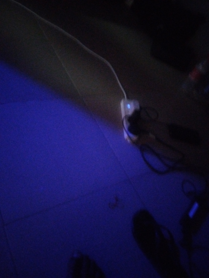 A dark, somewhat blurry image depicts a room illuminated by a blue light source from the left. A white cable stretches across the floor, connecting to a power adapter with a blue LED indicator. Other dark objects, including what appears to be footwear, are scattered across the floor. The lighting obscures details and creates strong shadows.