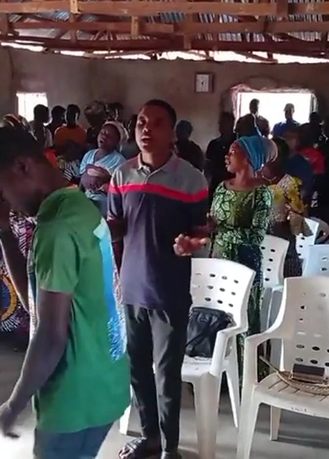 A large group of people are gathered in a room, likely a church, with a corrugated metal roof supported by wooden beams. The walls are painted light gray, and natural light enters through windows. Most of the people are standing and singing, while some are seated on white plastic chairs. A man in a green shirt appears to be emotionally moved, wiping his eyes. Another man in a red, yellow, and blue striped shirt stands to the right, watching the group. A woman in a yellow shirt and patterned skirt is standing near a wooden drum, possibly leading the singing. There is a general atmosphere of worship and community.