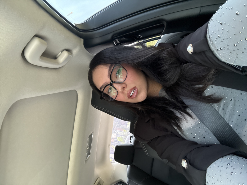 A female individual is depicted in the front passenger seat of a vehicle in Medellín, Colombia. She has long, dark hair, wears black-framed glasses, and her gaze is directed towards the camera. Her lips are parted, showing a glossy finish. She is dressed in a light gray top adorned with numerous small, reflective embellishments, possibly studs or rhinestones, over which she wears a dark, possibly black, blazer. The blazer sleeves are rolled up and secured with a buttoned tab featuring a spherical, light-colored button. A black seatbelt is visible across her chest and shoulder. The vehicle's interior features black leather seats and a light-colored headliner with a visible sunroof and an overhead grab handle. Through the rear passenger window, green foliage is visible, indicating an outdoor setting during daylight. The image appears to be a self-portrait taken from a slightly low angle.