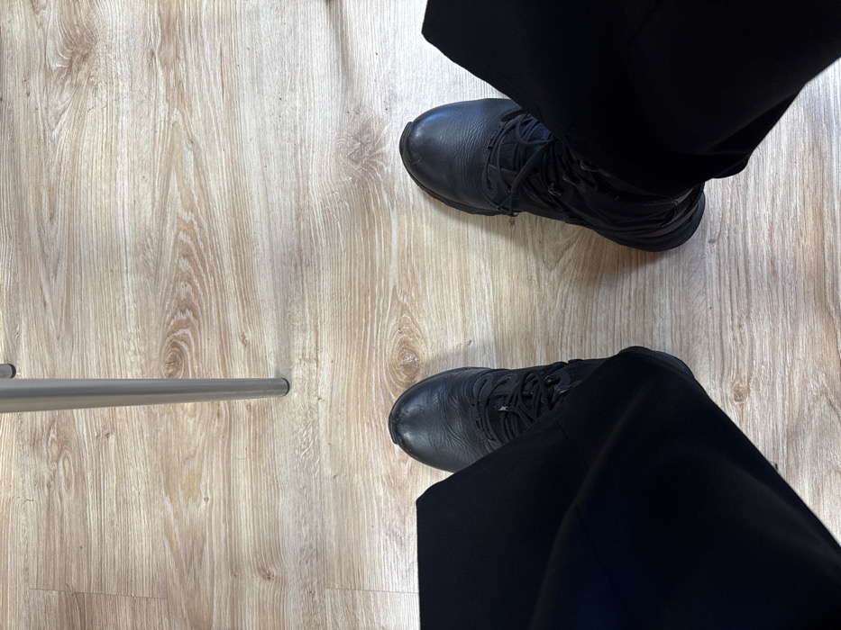 The image displays a downward-facing view of an individual's lower extremities within an indoor setting. The subject wears dark, likely black, trousers and dark, laced footwear, consistent with black boots or sturdy shoes. Both feet are positioned on a light-colored floor exhibiting a laminated wood grain pattern. A single metallic cylindrical leg of what appears to be furniture is visible vertically in the upper half of the frame, centered above the feet, also resting on the wooden floor. The scene is static. The location is Varna, Bulgaria.