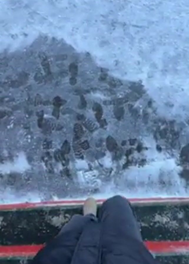 person walking on a snowy, icy surface. The person is wearing beige boots, dark blue pants, and a dark blue jacket. The ground is covered with a mix of snow and ice, and there are many footprints visible. The video is taken from a first-person perspective, looking down at the person's feet as they walk.